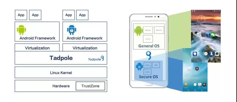 基于系統(tǒng)虛擬化技術(shù),在單一核心下執(zhí)行兩個(gè)完整的Android系統(tǒng)。每一個(gè)Android系統(tǒng)皆具備完整的執(zhí)行功能并且兼容于第三方軟件。兩個(gè)Android系統(tǒng)互不依賴,完全獨(dú)立。當(dāng)Tadpole系統(tǒng)啟動(dòng)后,可視需求或環(huán)境狀況只啟動(dòng)任一系統(tǒng),也可以據(jù)實(shí)際狀況完全關(guān)閉任一系統(tǒng)。例如在極機(jī)密環(huán)境中,公開日常系統(tǒng) (Public/General OS) 就完全關(guān)閉,而不僅是隱藏在背景執(zhí)行。