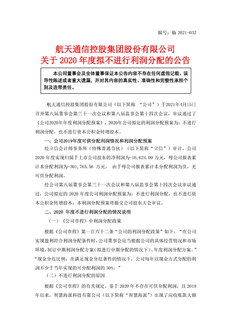 航天通信控股集團股份有限公司關于2020年度擬不進行利潤分配的公告