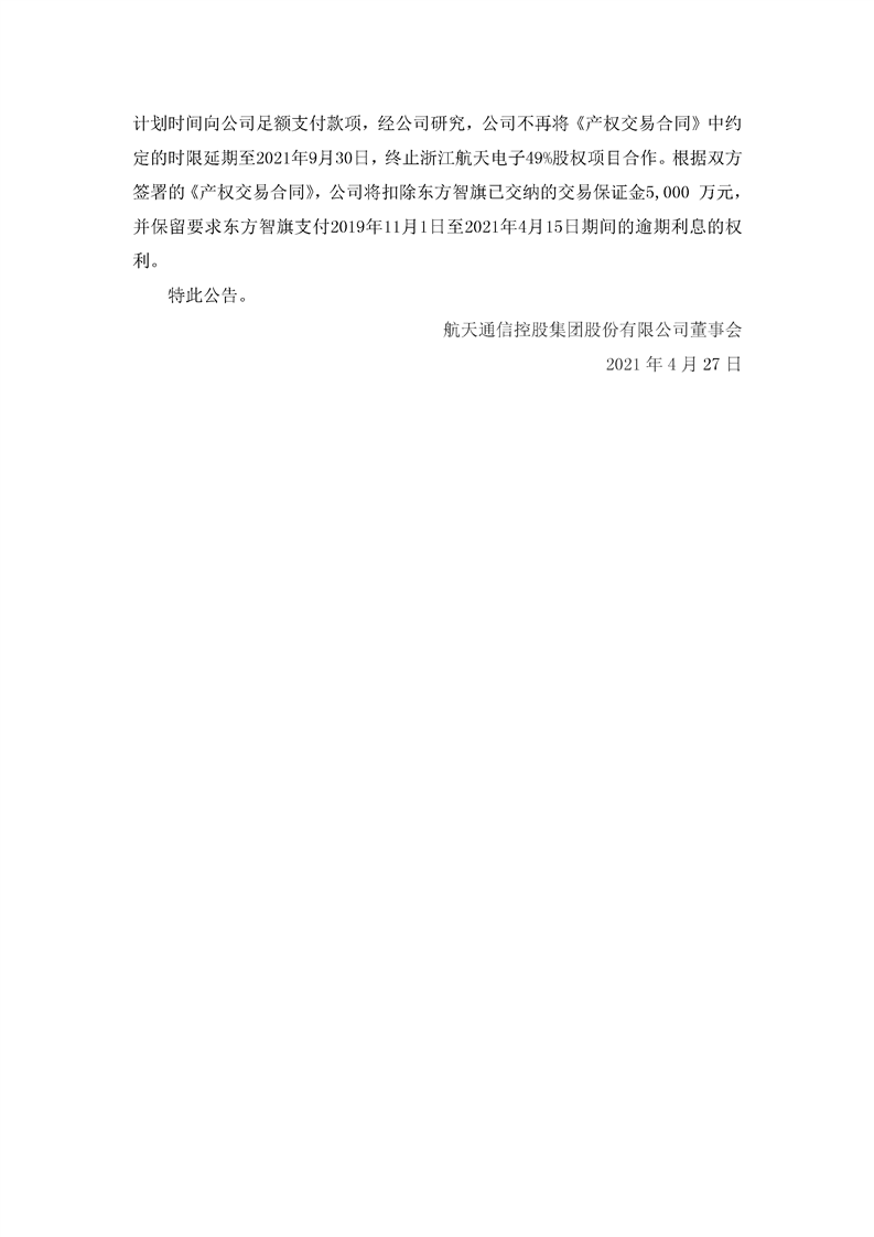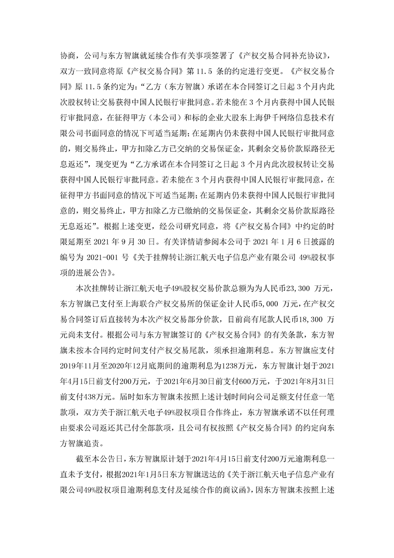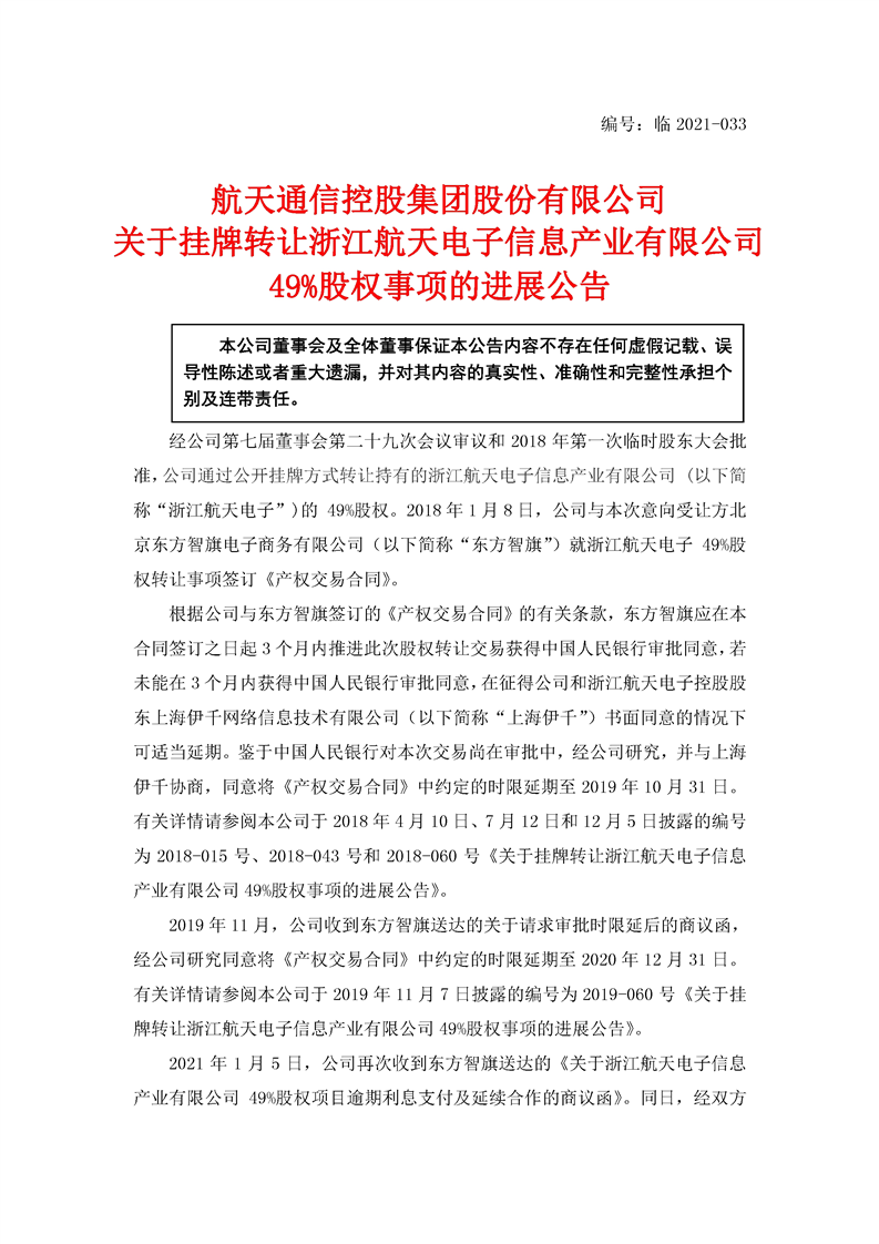 航天通信關(guān)于掛牌轉(zhuǎn)讓浙江航天電子信息產(chǎn)業(yè)有限公司49%股權(quán)事項(xiàng)的進(jìn)展公告