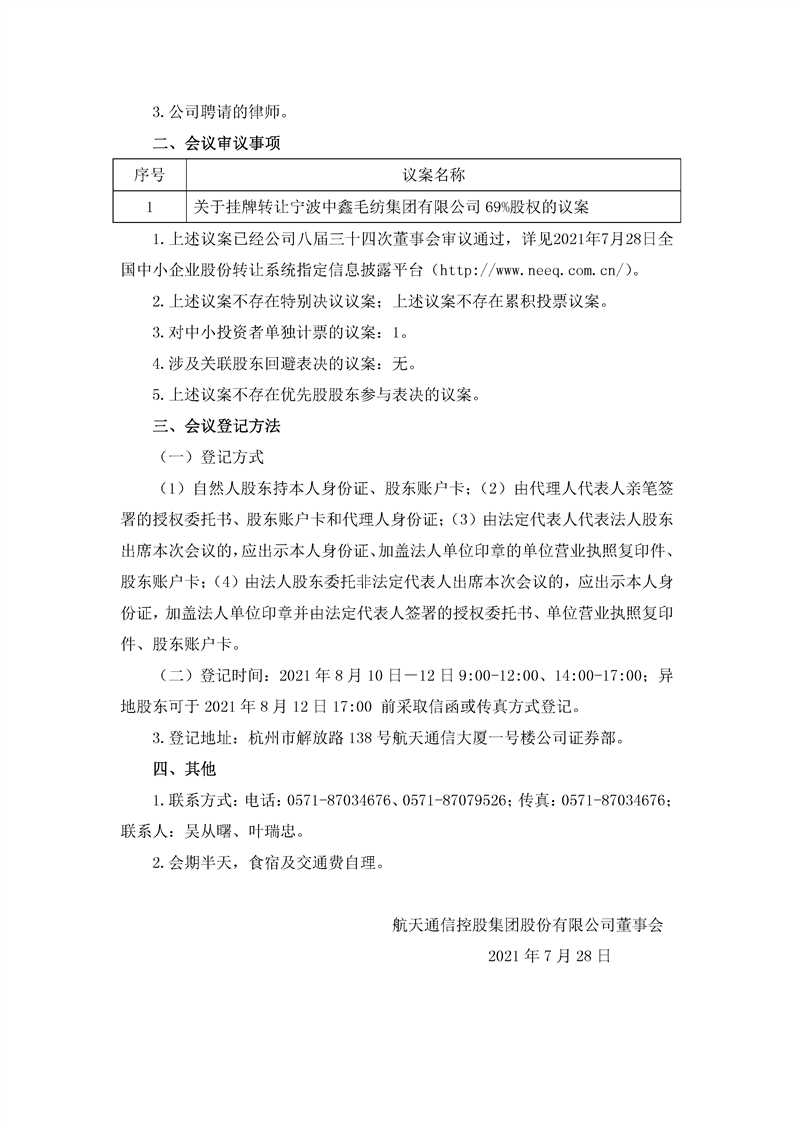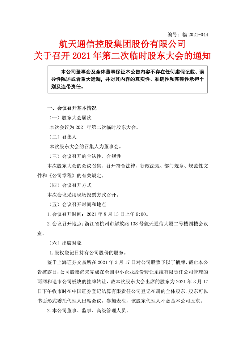 航天通信控股集團股份有限公司關于召開2021年第二次臨時股東大會的通知