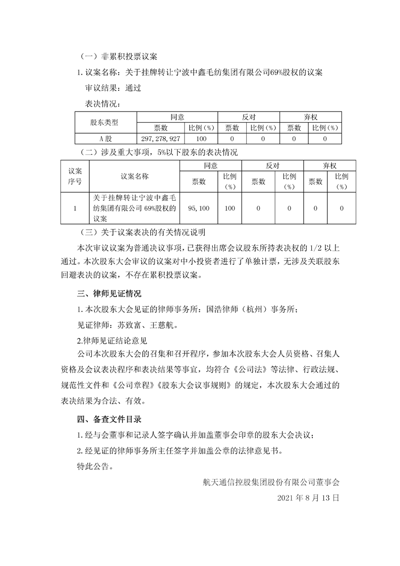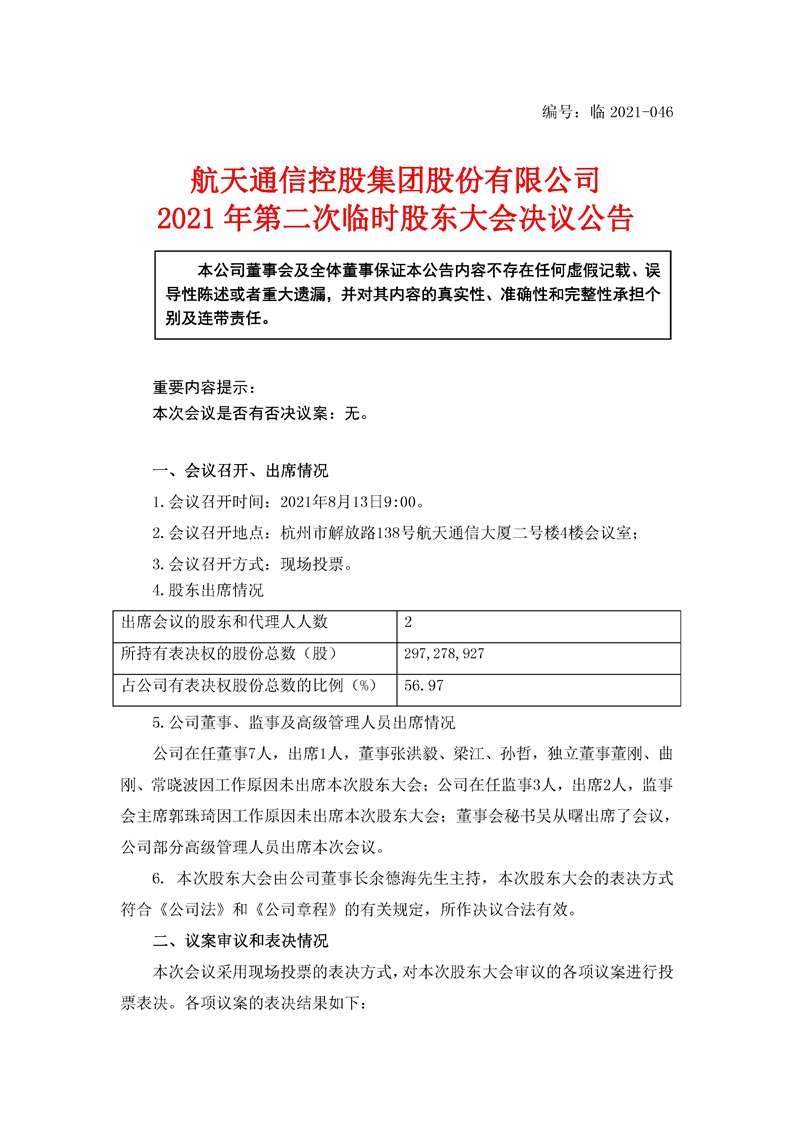 航天通信控股集團股份有限公司2021年第二次臨時股東大會決議公告