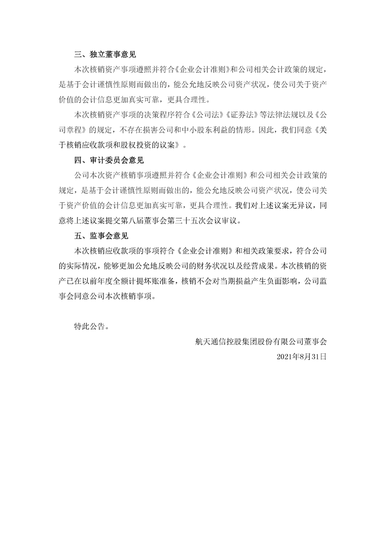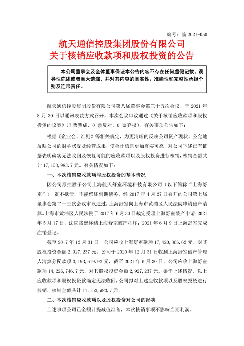 航天通信控股集團股份有限公司關于核銷應收款項和股權投資的公告